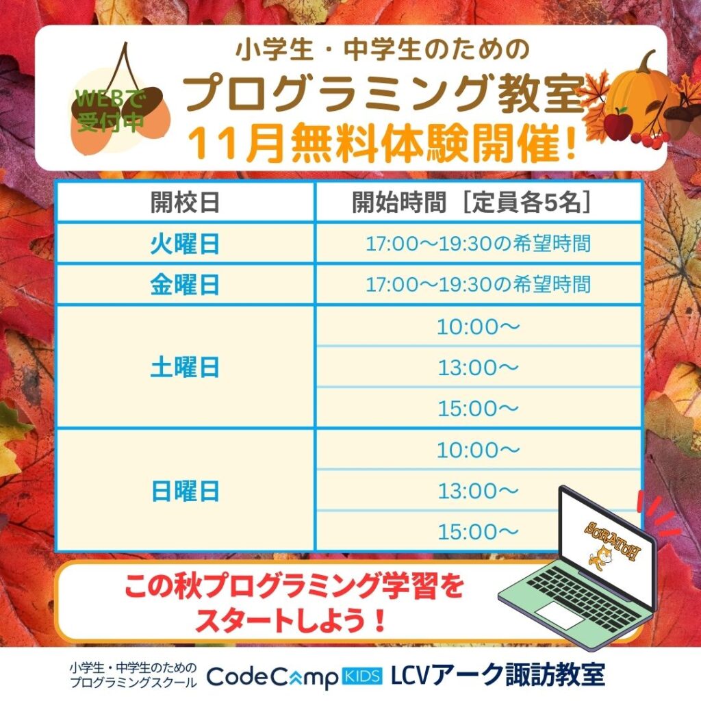 【通話料無料】受付時間 9:00〜18:00※案内にプログラミング教室係とお伝えください