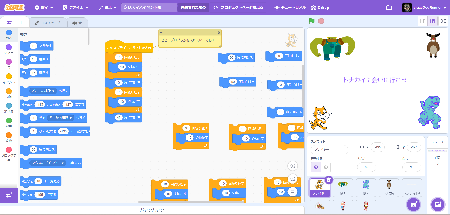 ①プレイヤー(ネコ)を、トナカイの位置まで導くプログラムを作成する