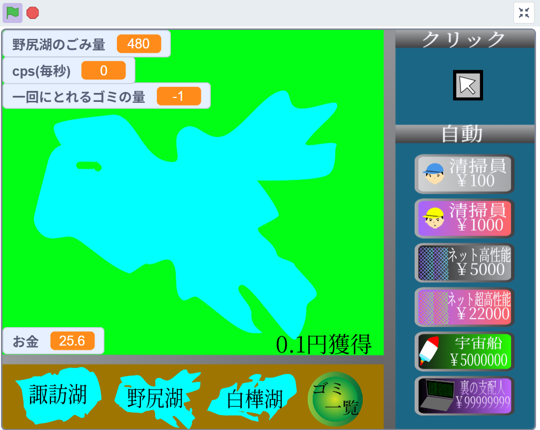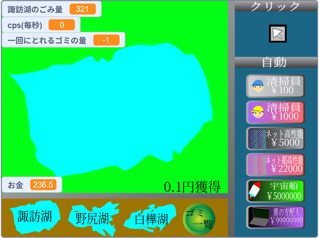 それぞれの湖には『ごみ量』という個別の変数が存在し、すべての湖のごみを清掃しきったらゲームクリアとなります。